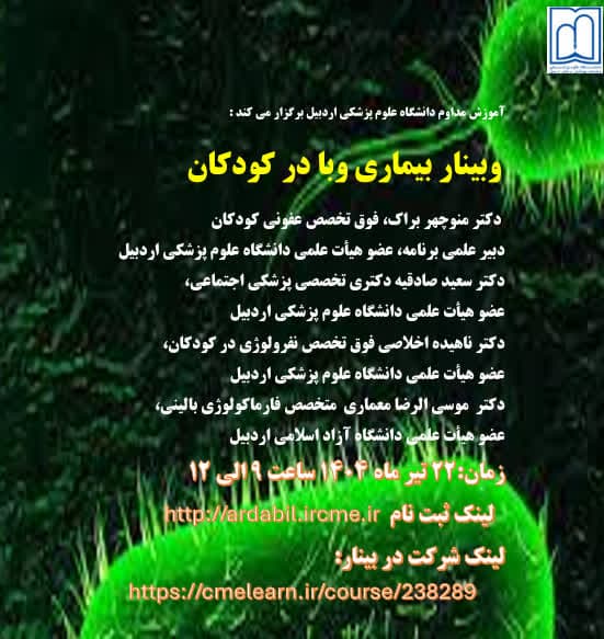 مرکزآموزش مداوم دانشگاه علوم پزشکی اردبیل برگزار می کند: وبینارآموزشی، بیماری وبا در کودکان