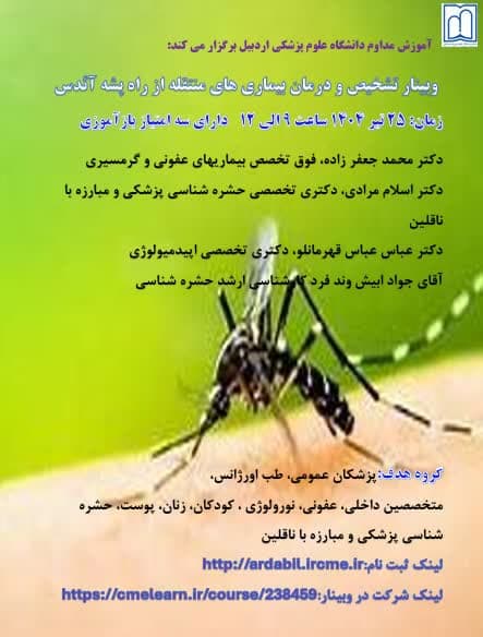 مرکز آموزش مداوم دانشگاه علوم پزشکی اردبیل برگزار می کند: وبینار آموزشی، تشخیص و درمان بیماریهای منتقله از راه پشه آئدس
