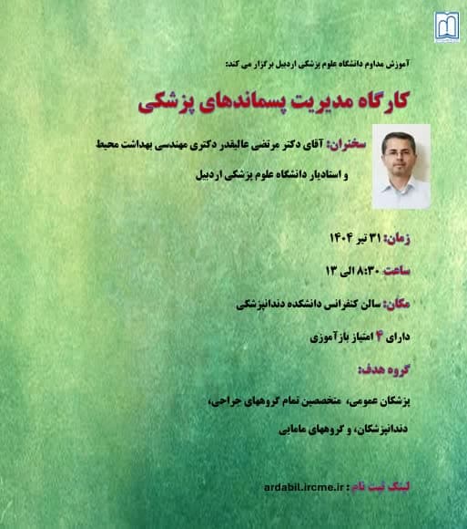 مرکز آموزش مداوم دانشگاه علوم پزشکی اردبیل برگزار می کند: کارگاه آموزشی پسماندهای پزشکی، با تدریس جناب آقای دکتر مرتضی عالیقدری عضو محترم هیات علمی دانشگاه در روز سه شنبه مورخه 1404/04/31 از ساعت 8:30 الی 13
