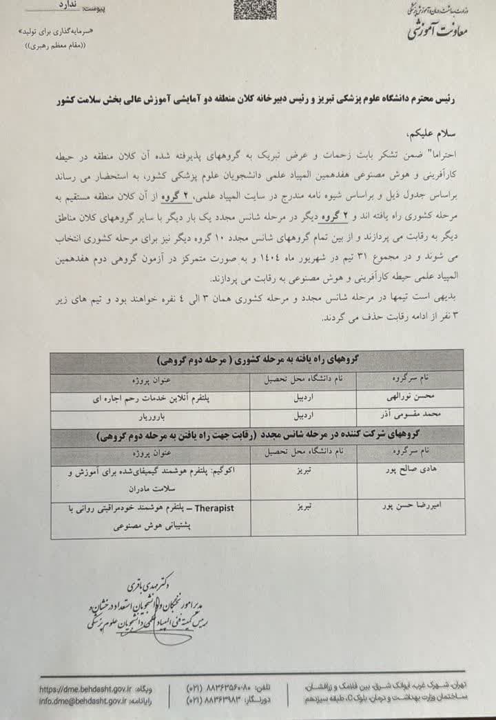 در مرحله اول آزمون و ارائه پروژه گروهی حیطه کارآفرینی و هوش مصنوعی که در مرکز کلان منطقه دو، دانشگاه علوم پزشکی تبریز، انجام شد از بین تیم های شرکت کننده از دانشگاه ها و دانشکده های کلان منطقه دو، دو تیم دانشگاه علوم پزشکی اردبیل موفق به کسب سهمیه راهیابی مستقیم به مرحله کشوری شدند و دو تیم از دانشگاه علوم پزشکی تبریز بعد از تیم های اردبیل به رقابت شانس مجدد دست پیدا کردند.
