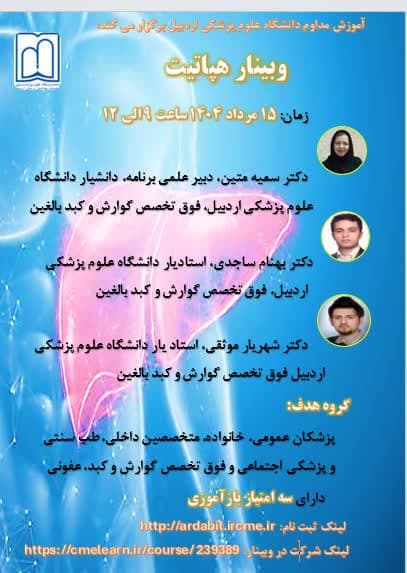 مرکز آموزش مداوم دانشگاه علوم پزشکی اردبیل برگزار می کند: وبینار آموزشی هپاتیت در روز چهارشنبه مورخه 1404/05/15 از ساعت 9 الی 12، با تدریس سه نفر از پزشکان و اعضای هیات علمی بالینی دانشگاه علوم پزشکی اردبیل
