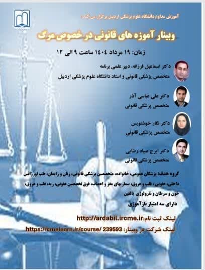 مرکز آموزش مداوم دانشگاه علوم پزشکی اردبیل برگزار می کند: وبینار آموزشی آموزه های قانونی در خصوص مرگ