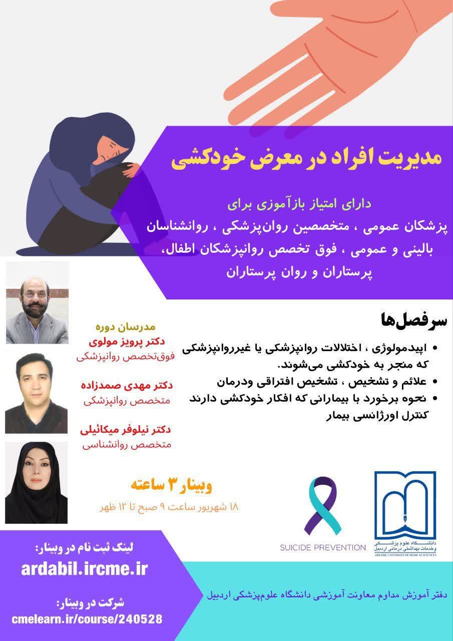 مرکز آموزش مداوم دانشگاه علوم پزشکی اردبیل برگزار می کند: وبینار آموزشی مدیریت افراد در معرض خودکشی در روز سه شنبه مورخه 1404/06/18 از ساعت 9 الی 12، با تدریس 3 نفر از اساتید برتر روانشناسی و روانپزشکی دانشگاه های علوم پزشکی و محقق اردبیل