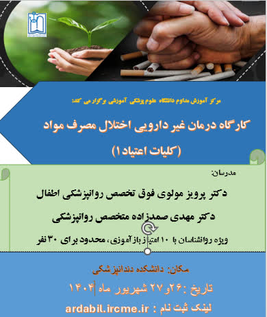مرکز آموزش مداوم دانشگاه علوم پزشکی اردبیل برگزار می کند: کارگاه درمان غیر داروئی اختلال مصرف مواد (کلیات اعتیاد)
