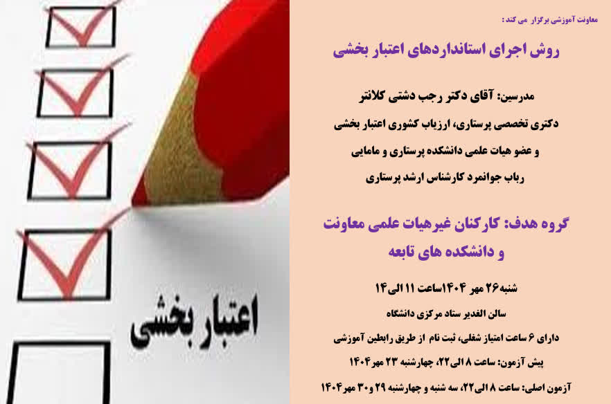 معاونت آموزشی دانشگاه برگزار می کند: کارگاه یک روزه با عنوان "روش اجرای استانداردهای اعتبار بخشی در دانشگاه" در روز شنبه مورخه 1404/07/26 از ساعت 11 الی 14 در سالن همایش الغدیر ستاد مرکزی دانشگاه.