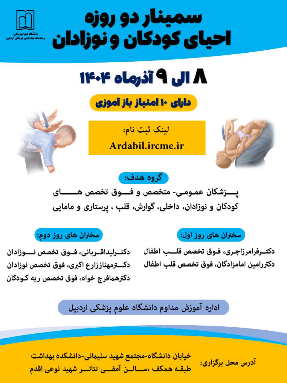 مرکز آموزش مداوم دانشگاه علوم پزشکی اردبیل برگزار می کند: سمینار دو روزه احیای کودکان و نوزادان در روزهای شنبه و یکشنبه تاریخ ۸ و ۹ آذر ماه سال ۱۴۰۴ در دانشکده بهداشت سالن آمفی تئاتر شهیدان نوعی اقدم با تدریس ۵ نفر از اعضای محترم هیات علمی بالینی دانشگاه علوم پزشکی اردبیل