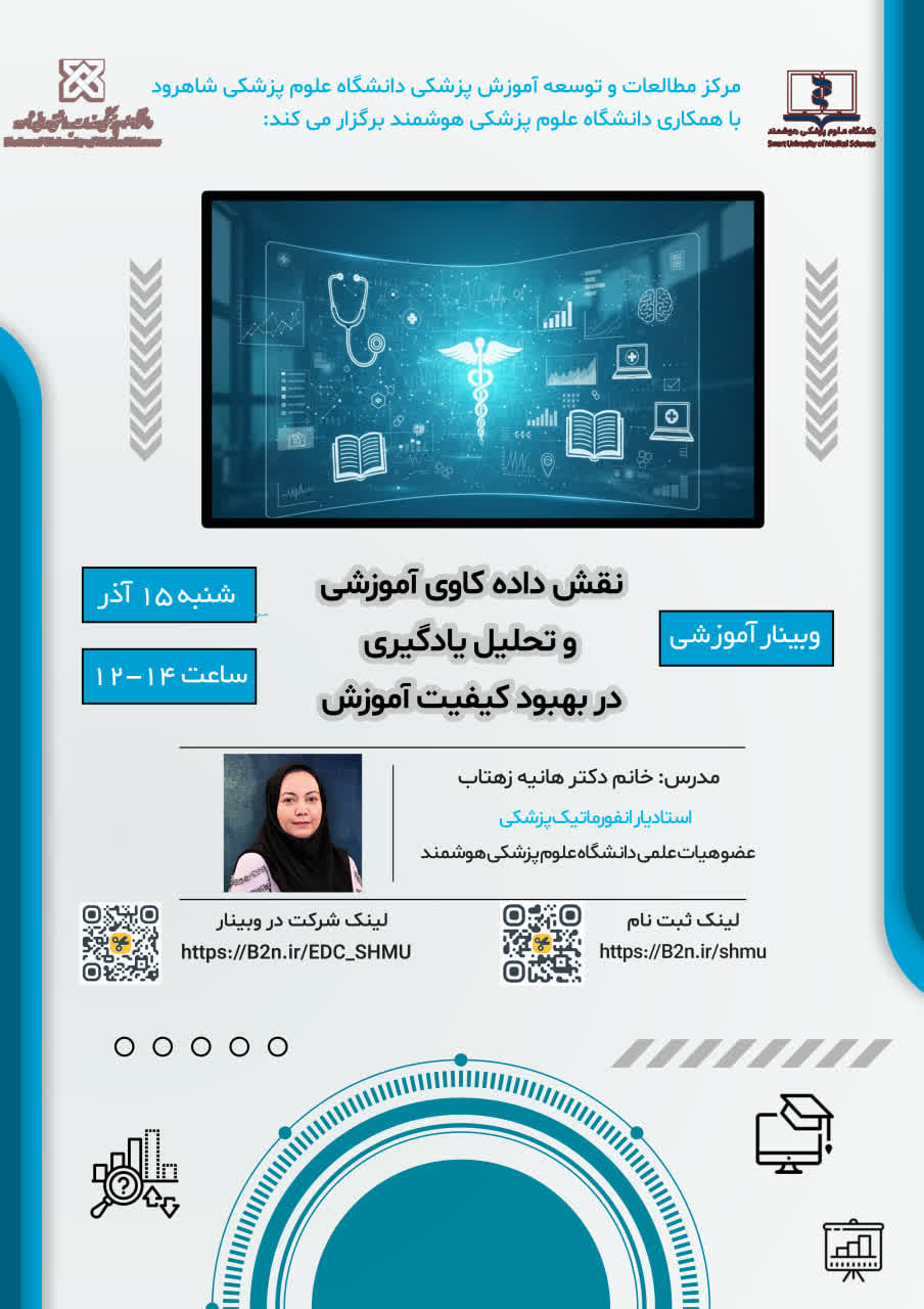 وبینار آموزشی با عنوان"نقش داده کاوی آموزشی و تحلیل یادگیری در بهبودکیفیت آموزش" با سخنرانی سرکارخانم دکتر هانیه زهتاب عضو هیات علمی دانشگاه علوم پزشکی شاهرود ، در تاریخ 15 آذر ماه 1404 از ساعت 12 الی 14 به صورت مجازی برگزار خواهد شد.